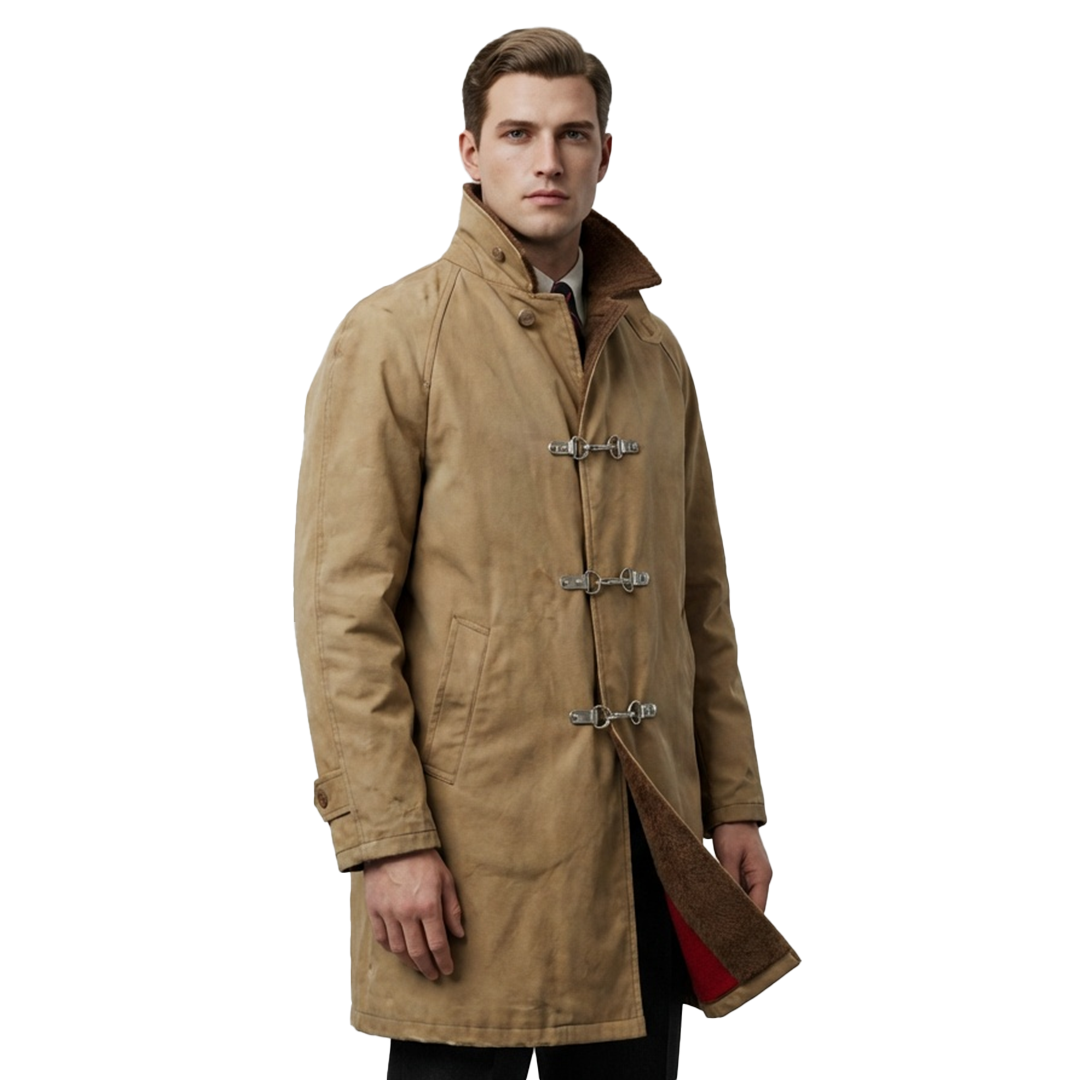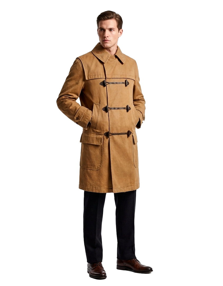 Twill di cotone egiziano impermeabilizzato, profondo collo a mantellina sulle spalle, lunghezza corta al ginocchio per libertà di movimento. Doppiopetto con iconici alamari in pelle, doppie tasche a pattina. Il duffle coat che definì un'epoca.